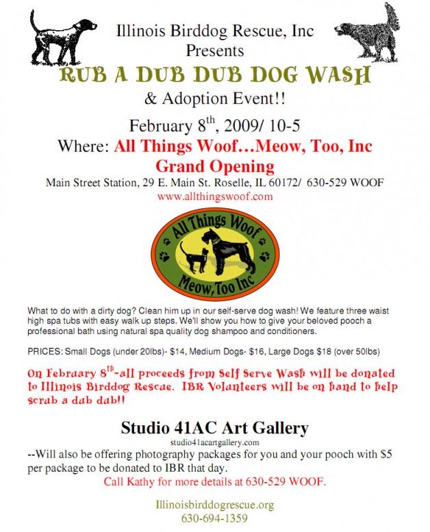 We hope to see everyone at the Illinois Birddog Rescue Rub a Dub Dub Dog Wash at All Things Woof Meow, Too on February 8. Click here to see a printable pdf.